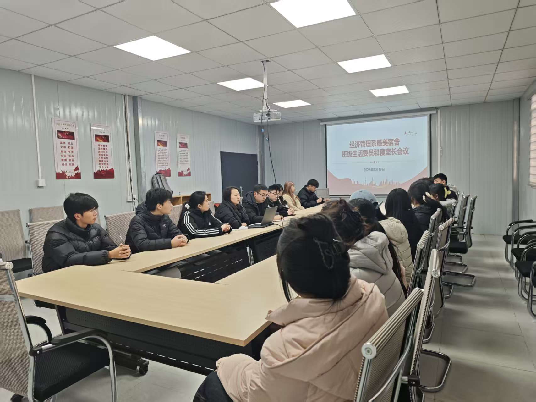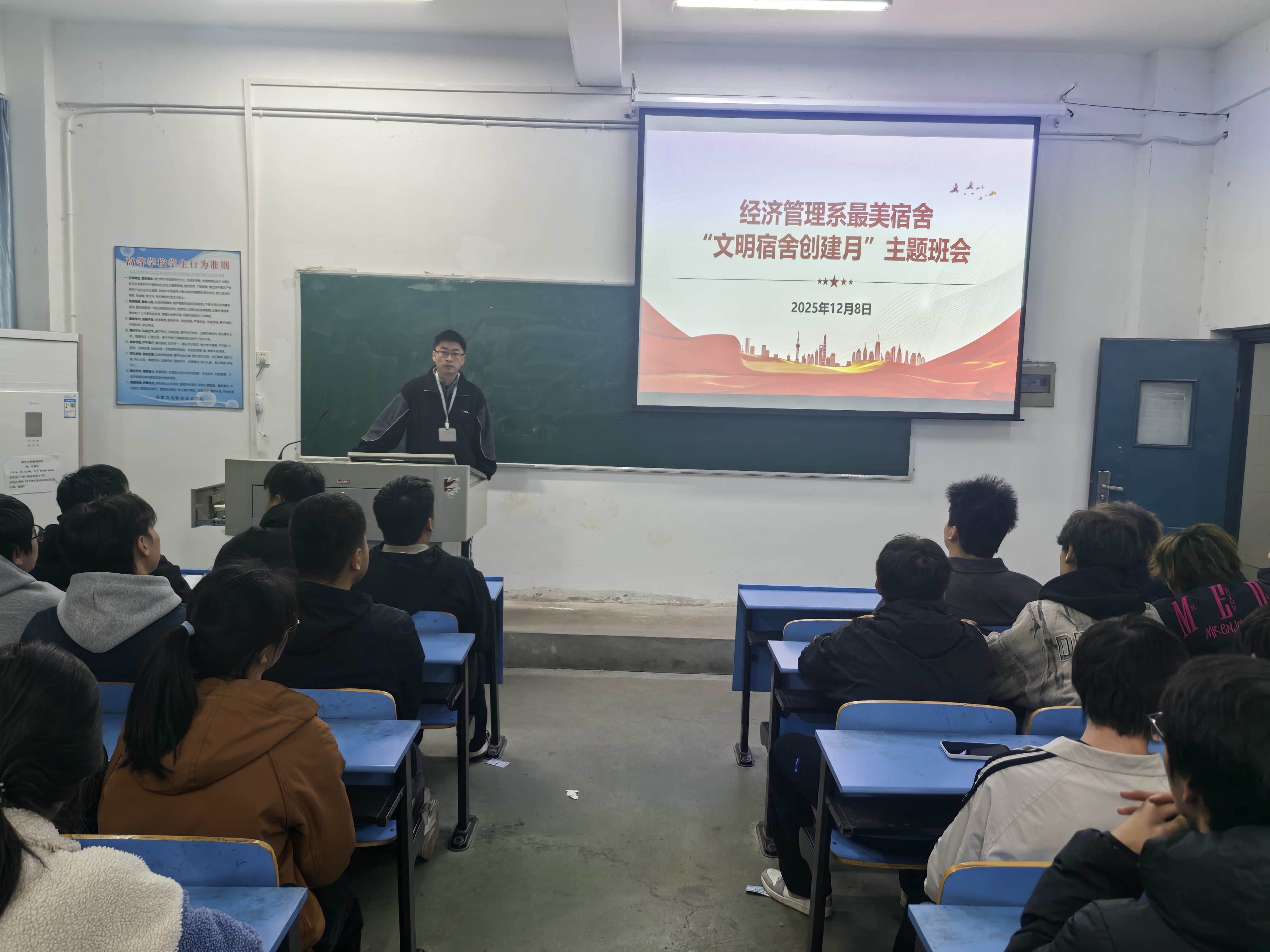为积极响应合肥共达职业技术学院2025 年度 “文明宿舍创建月” 活动号召,扎实推进无烟校园建设,打造整洁有序、创意十足、团结向上的宿舍生活空间,2025年12月8日至12月18日,经济管理系以班级为单位召开主题班会,12月9日召开班级生活委员和寝室长专项会议,并同步在系部网站发布《经济管理系关于开展 2025 年度 “文明宿舍创建月” 活动暨校级 “最美宿舍” 参评宿舍征集的通知》,全面启动 “文明宿舍创建月” 及校级 “最美宿舍” 参评征集动员宣传工作,引导全系学子积极践行审美素养、协作精神与环保理念,展现经管学子青春风采。