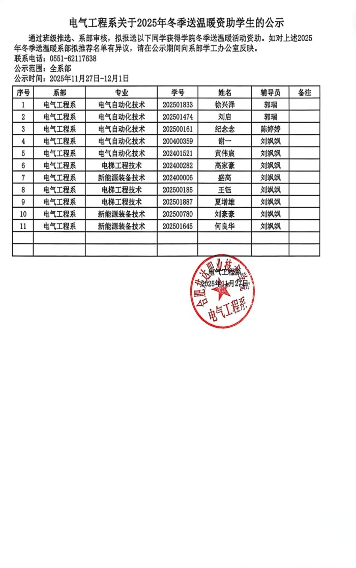 为落实合肥共达职业技术学院2025年冬季送温暖活动的相关安排,电气工程系严格对照学校要求推进工作,已顺利完成资助学生的选拔、审核环节,并于11月27日对拟资助的11名家庭经济困难学生名单进行公示。
