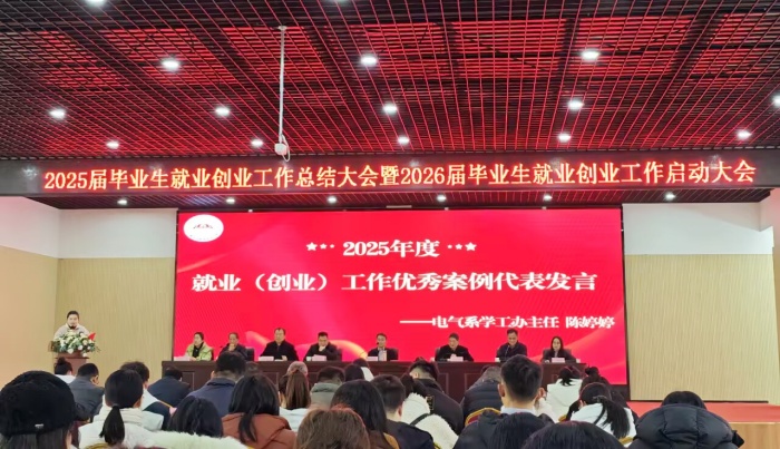 12月24日下午,我校“2025届毕业生就业创业工作总结大会暨2026届毕业生就业创业工作启动大会”顺利召开。会上,电气工程系收获多项荣誉:学工办主任陈婷婷凭借扎实的工作实践与典型案例挖掘,荣获“2025年度就业(创业)工作优秀案例” 表彰,并作为获奖代表上台发言;同时,电气工程系2025届毕业生毕业去向落实率在全校名列前茅,斩获8000元专项奖励,充分彰显了系部在就业创业工作中的扎实成效与突出实力。