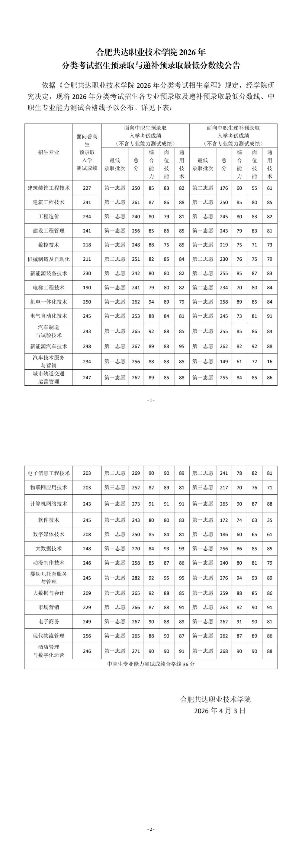 2026年分类考试招生预录取与递补预录取最低分数线公告