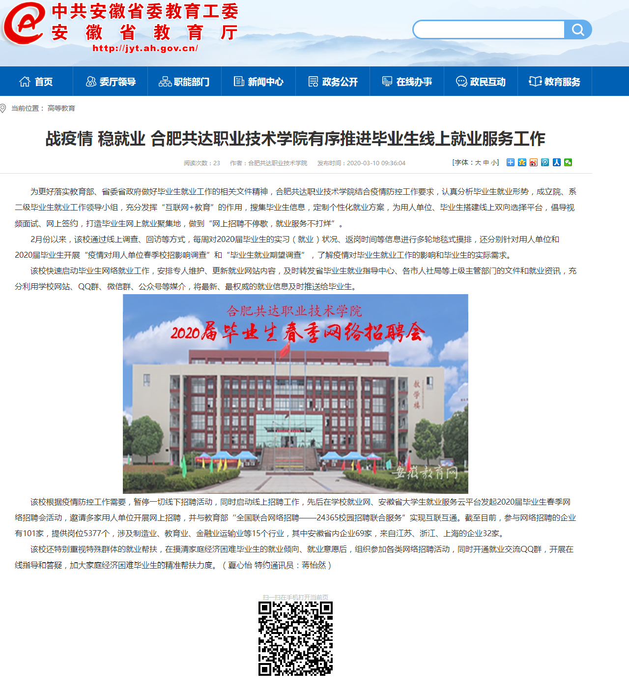 【安徽教育网】战疫情 稳就业 就业与创业指导中心有序推进毕业生线上就业服务工作