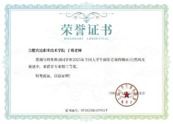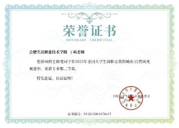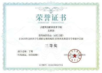 同系学生朱秋羽则收获双重荣誉,成为本次赛事中的一大亮点。其作品《霓虹合肥》在城市/自然风光赛道非专业组中斩获三等奖,作品聚焦合肥城市夜景,以霓虹光影为叙事线索,捕捉城市夜晚的活力与温度,用细腻的镜头语言勾勒出都市发展的鲜活图景,展现了对城市生活的敏锐观察与独特表达。同时,朱秋羽在赛事志愿者宣传工作中积极奉献、履职尽责,凭借认真负责的工作态度与突出的工作成效,获评“优秀志愿者”称号,用实际行动践行了“奉献、友爱、互助、进步”的志愿精神,为赛事的顺利开展贡献了青春力量。