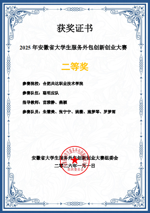 2025年安徽省大学生服务外包创新创业大赛圆满落幕,来自合肥共达职业技术学院经济管理系的三支参赛队在赛事中表现亮眼,斩获省级二等奖3项。