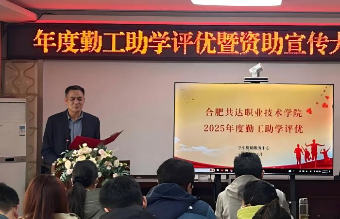 发布时间:2026-04-16 来源:合肥共达职业技术学院4月15日,学院举办2025年度勤工助学评优暨2026年学生资助宣传大使评选活动。学院副院长张立龙出席活动。学生资助服务中心主任丁美双,学生处、团委、总务处、信息中心、教务处等勤工助学用人部门负责人,各系学工办主任参加活动。活动由丁美双主持。