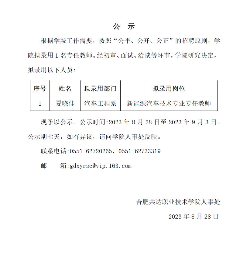 汽车工程系拟录用人员公示