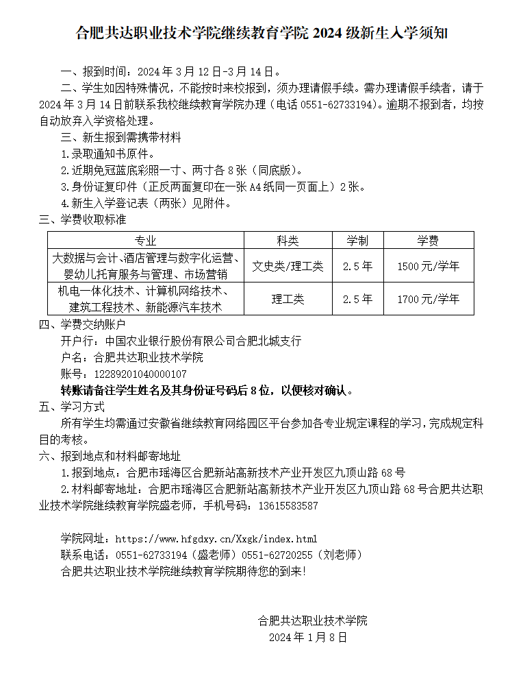 合肥共达职业技术学院继续教育学院2024级新生入学须知