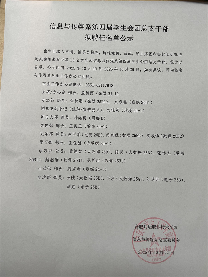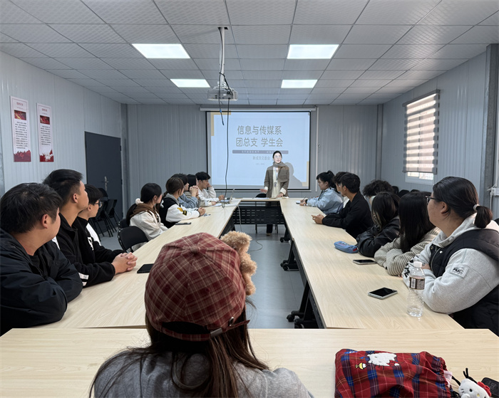 10 月 22 日中午,信息与传媒系学生会团总支开展迎新会,由指导老师龚南雁组织和主持,学生会主席、各部门部长及全体新成员共同参与,为新成员融入学生组织搭建沟通桥梁。